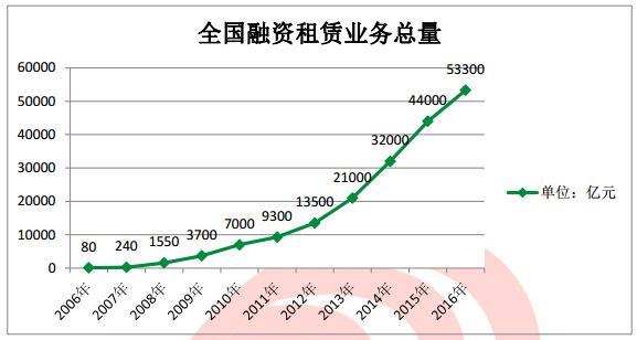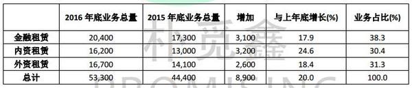 據(jù)測算,截至2016年底,全國融資租賃合同余額約53,300億元人民幣,比2015年底的44,400億元增加約8,900億元,增長20%。其中:金融租賃約20,400億元,增加3,100億元,同比增長17.9%;內(nèi)資租賃約16,200億元,增加3,200億元,同比增長24.6%;外商租賃約合16,700億元,增加2,600億元,同比增長18.4%。