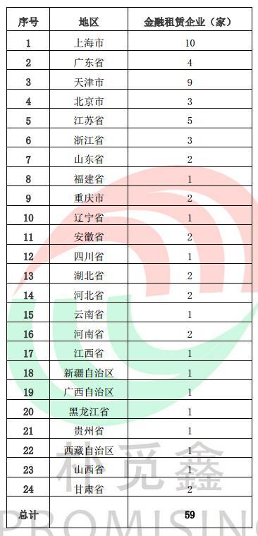 據(jù)統(tǒng)計,截至2016年底全國共有59家金融租賃公司,分布在全國24個省、市、區(qū)。