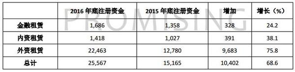 數(shù)據(jù)顯示,截至2016年底,全國融資租賃行業(yè)注冊資金統(tǒng)一以1:6.9的平均匯率折合成人民幣計算,約合25,567億元,比上年底的15,165億元增加10,402億元,增長了68.6%。其中:內(nèi)資試點租賃企業(yè)注冊資金1,418億元,增加391億元;金融租賃為1,686億元,增加328億元;外資租賃增加最多,約為22,463億元,增加9,683億元。