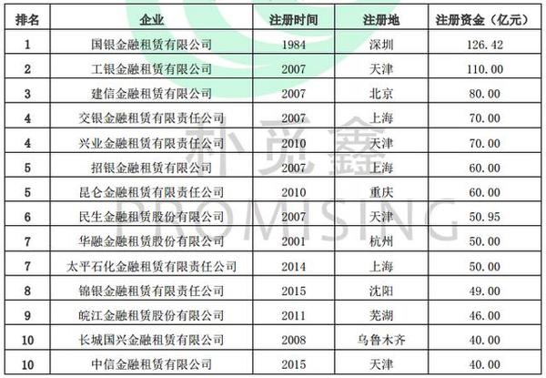 據(jù)統(tǒng)計,在以注冊資金為序的2016年全國金融租賃公司十強排行榜中,國銀金融租賃股份有限公司以126.42億元人民幣位居首位。