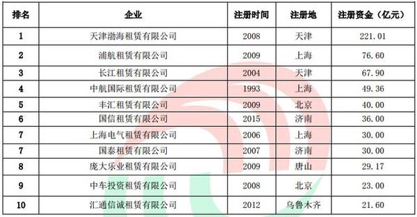 數(shù)據(jù)顯示,在以注冊資金為序的全國內(nèi)資試點融資租賃企業(yè)十強排行榜中,天津渤海租賃有限公司以221.01億元人民幣位居首位。