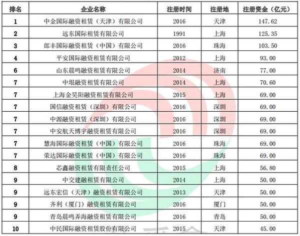 數(shù)據(jù)顯示,在以注冊資金為序的2016年全國外資融資租賃企業(yè)十強排行榜中中金國際融資租賃(天津)有限公司以147.62億元人民幣位居首位。